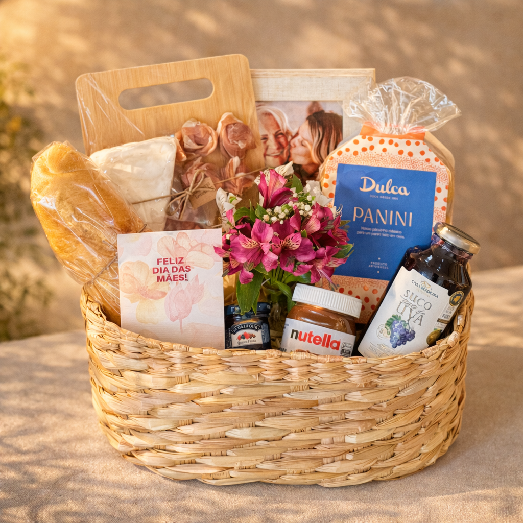 A tábua de frios com presunto cru, salame, brie e gouda, acompanhada da baguete francesa e do panini da Dulca Confeitaria, cria uma experiência completa e cheia de sabor. A geleia St. Dalfour, a Nutella e o suco de uva Casa Madeira complementam o momento com equilíbrio e carinho em cada detalhe.