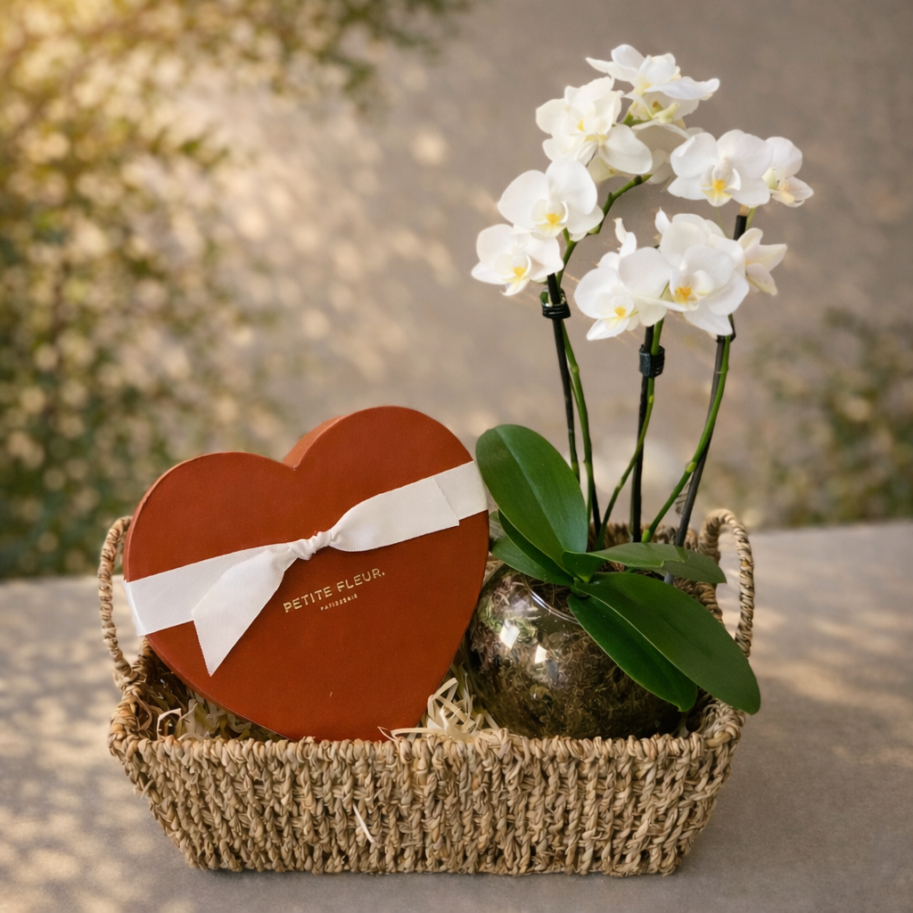 A Baby Orquídea no vasinho de vidro traz delicadeza e leveza, enquanto a caixa coração com 9 docinhos da Petite Fleur Patisserie transforma o momento em uma experiência doce e especial.