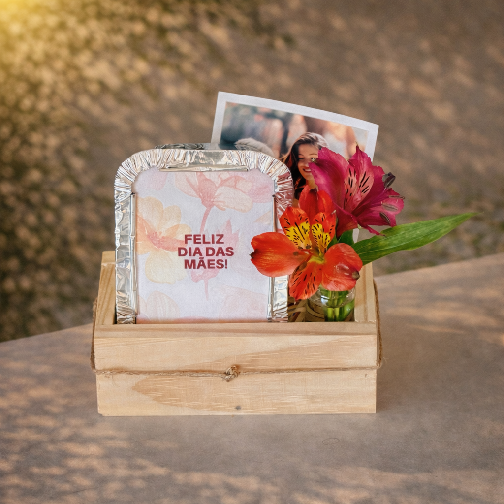 O brownie especial de Dia das Mães traz um toque afetivo e cheio de carinho, enquanto o mini vaso de astromélias adiciona leveza e frescor. A foto estilo polaroid transforma o presente em uma lembrança única, eternizando um momento especial.