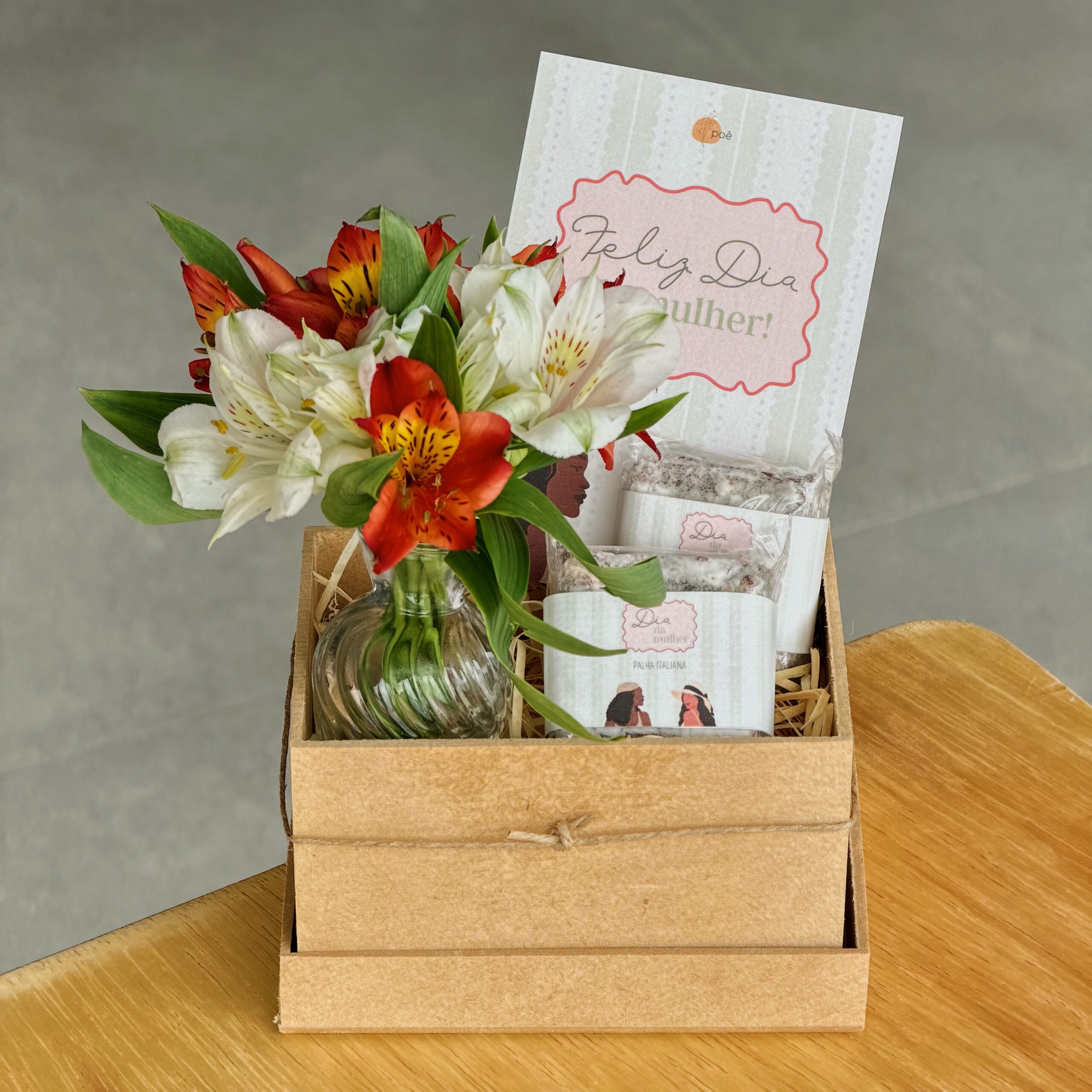A composição combina duas palhas italianas artesanais com arte exclusiva de Dia da Mulher e um vaso de vidro com arranjo de astromélias naturais, criando um equilíbrio entre doçura e frescor. A apresentação em caixa de madeira MDF reforça o acabamento premium e valoriza ainda mais a experiência de entrega.