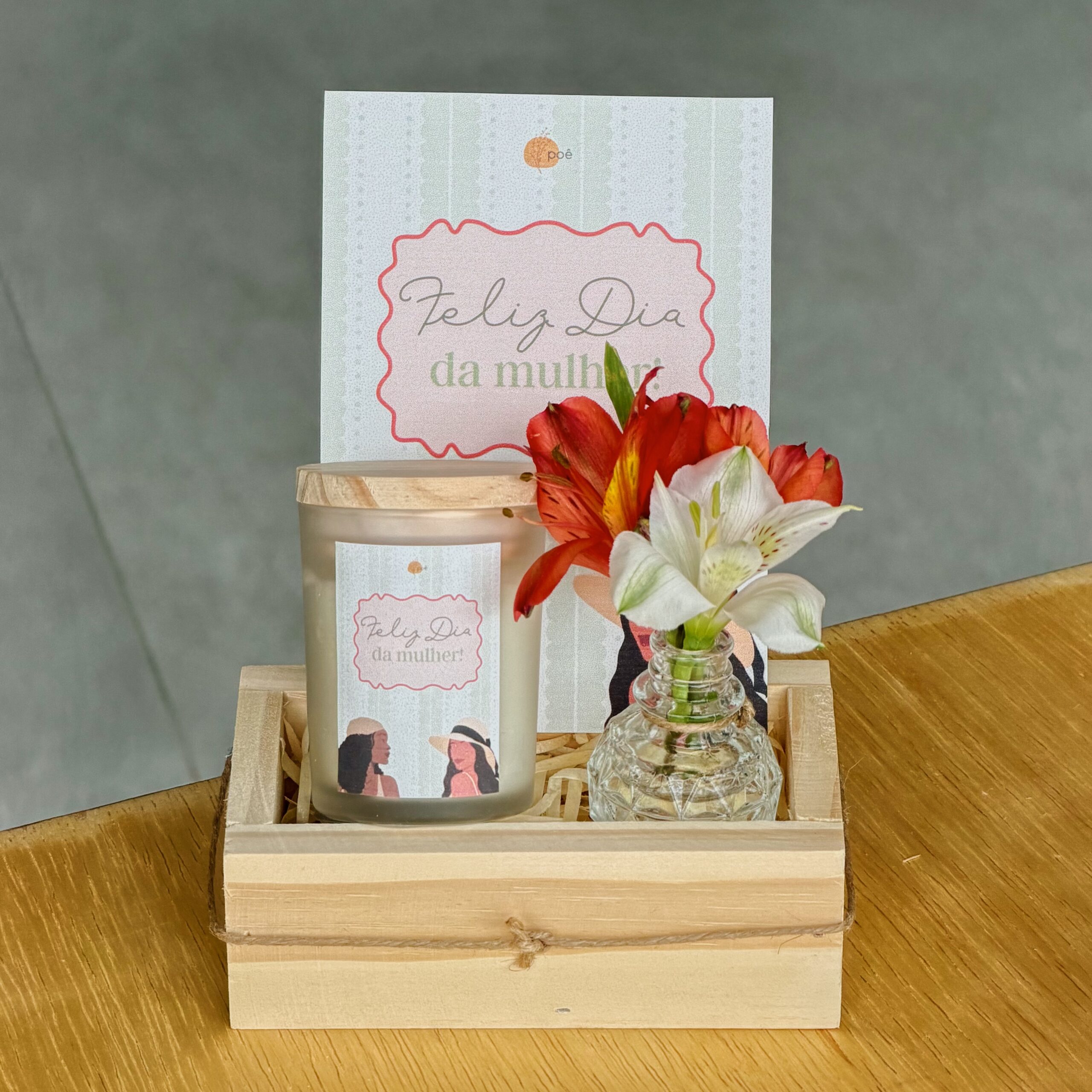 A vela aromática com tampa de madeira e arte exclusiva de Dia da Mulher cria um momento de acolhimento e bem-estar, enquanto o mini vaso com arranjo de flores naturais traz leveza e beleza à composição. A apresentação em mini caixote de madeira pinus reforça o acabamento artesanal e sofisticado, característica marcante das cestas personalizadas da Poê.